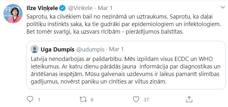 Piecas dienas - tieša apdraudējuma Latvijas iedzīvotājiem nav. Atcerieties to tagad - Veselības ministre to konkrēti zināja un varēja paziņot. Un nevajag tagad stāstīt, ka situācija ir mainījusies - vienkārši notika tas, par ko Ilze Viņķele apgalvoja, ka nekā tāda nav.